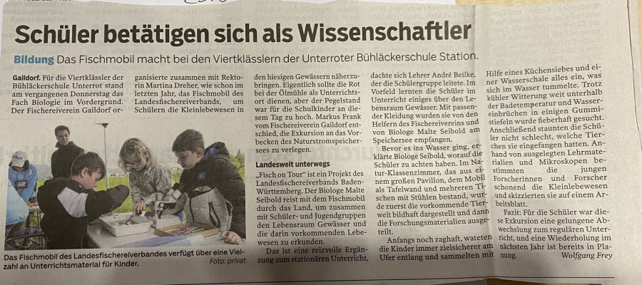 Am 11. Mai Organisierte der Fischereiverein Gaildorf zusammen mit der Bühläckerschule Unterrot ein Klassenzimmer im Grünen zu dem auch das Fischmobil des LFVBW dazukam.